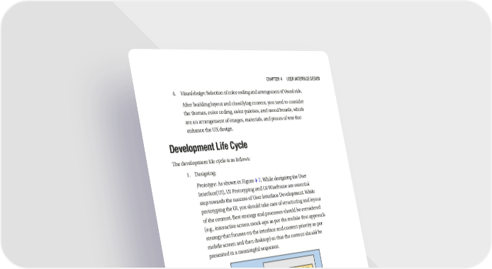 Chapter 4 User InterfaCe DesIgn 4. Visual design: Selection of color coding and arrangement of Visual aids. After building layout and classifying content, you need to consider the themes, color coding, color palettes, and mood boards, which are an arrangement of images, materials, and pieces of text that enhance the UX design. Development Life Cycle The development life cycle is as follows: 1. Designing: Prototype: As shown in Figure 4-7, While designing the User Interface(UI), UI Prototyping and UI Wireframe are essential step towards the success of User Interface Development. While prototyping the UI, you should take care of structuring and layout of the content. Best strategy and processes should be considered (e.g., interactive screen mock-ups as per the mobile-first approach strategy that focuses on the interface and content priority as per mobile screen and then desktop) so that the content should be presented in a meaningful sequence. UI Wireframe Designing Or Prototyping UI Screens UI User Interface Implementing Development Scripting Unit Testing Test Release Build Figure 4-7. User Interface Development life cycle 129