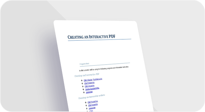 CREATING AN INTERACTIVE PDF Programs Used In this tutorial I will be using the following programs and information web sites: Creating and interactive PDF CS6 InDesign Starting guide CS6 Photoshop CS6 Fireworks Adobe Acrobat X Pro Javascript Creating an interactive website CS6 Photoshop CS6 Fireworks Javascript HTML HTML5 CSS CSS3 FileZilla http://www.w3schools.com/ WordPress WordPress Plugins Codex.wordpress.org Lynda.com Learning Network Queensland | Brisbane North Institute of TAFE 10