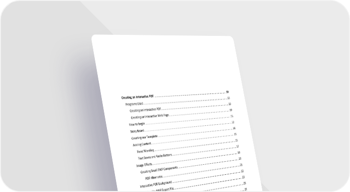 Creating an Interactive PDF ............................................................................................................ 10 Programs Used ............................................................................................................................ 10 Creating an Interactive PDF...................................................................................................... 10 Creating an Interactive Web Page ............................................................................................ 10 How to begin ............................................................................................................................... 11 Story Board.................................................................................................................................. 12 Creating our Template ................................................................................................................. 14 Adding Content............................................................................................................................ 15 Fixed Wording ......................................................................................................................... 15 Text Boxes and Radio Buttons .................................................................................................. 17 Image Effects ............................................................................................................................... 19 Creating Small SWF Components ............................................................................................. 20 PDF Alternates .................................................................................................................... 21 Interactive PDF Background ......................................................................................................... 22 Creating the SWF Export File ........................................................................................................ 23 Final Steps of Interactive PDF ....................................................................................................... 25 Buttons .................................................................................................................................... 25 Hyperlinks- PDF’s and Web Pages ............................................................................................ 26 Submit Button ......................................................................................................................... 27