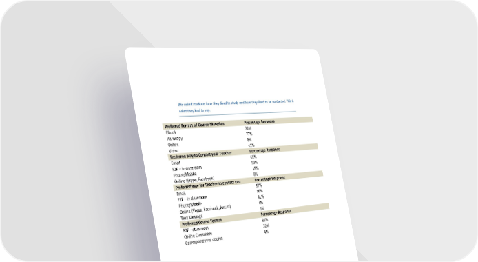 We asked students how they liked to study and how they liked to be contacted. This is what they had to say. Preferred Format of Course Materials Percentage Response EBook 32% Hardcopy 77% Online 8% Video <1% Preferred way to Contact your Teacher Percentage Response Email 61% F2F – in classroom 53% Phone/Mobile 15% Online (Skype, Facebook) 8% Preferred way for Teacher to contact you Percentage Response Email 57% F2F – in classroom 16% Phone/Mobile 41% Online (Skype, Facebook, forum) 4% Text Message 3% Preferred Course Format Percentage Response F2F – classroom 85% Online Classroom 32% Correspondence course 4% Learning Network Queensland | Brisbane North Institute of TAFE 40