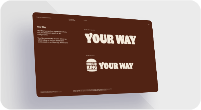 Burger King® Brand Identity Guidelines Visual Identity Your Way 059 Signature Lockups Your Way Your Way (with no Registration) Your Way is one of our signature lockups, and should always appear in this configuration. Your Way should only be used locked up with the logo at the end of television commercials in our Mayo Egg White color. Your Way (Logo Lockup) TM & © 2020 Burger King Corporation. All Rights Reserved. Usage of the Burger King® trademarks and logos varies by country. The BKC Regional and Global Marketing Team, Confidential and Proprietary Information of The Burger King Corporation and BKC Legal Team must approve proposed usage of any trademark or logo prior to its release.