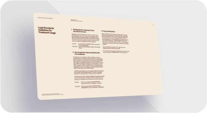 Burger King® Brand Identity Guidelines Legal Standards 124 Guidelines for Trademark Usage Legal Standards 1. Distinguish the trademark from 3. Copy specifications Guidelines for the rest of the text. When referring to the Company’s trade names, such as Trademark Usage Trademarks should always be used in a manner that Burger King Corporation in the United States, capitalize will distinguish them from the surrounding text. At the only the initial letter of each word. However, when using very least, they should be written in all capital letters. the trademarks, you must distinguish them from the They may also be set in quotation marks, italics or bold surrounding text. At the very least, they should be written font. This rule would apply everywhere and every time in all capital letters (e.g., “BURGER KING®”). They may a mark is used in any piece of written material. also be set in quotation marks or italics. This rule applies everywhere and every time a mark is used in any written Correct: At participating BURGER KING® restaurants material. in the United States. Use the trademark notation TM or SM next to the Incorrect: At participating Burger King’s in the United trademarks each time they are used. States. Do not break the Company’s trademarks from line to line, 2. Use the generic name associated with e.g., always place “BURGER KING®” on the same line. the trademark. A trademark is an adjective which modifies a noun. In printed matter of all types, and particularly in advertising copy, the generic name (noun) should be used immediately after the first or most prominent use of the trademark on each page. Thereafter, the generic name need not be used every time the trademark appears, but it should be used often enough to make it obvious that the trademark is not the generic name. For example, “at participating BURGER KING® restaurants in the United States”. To determine whether you are using a trademark properly, ask yourself the following question: “Would a complete thought be expressed if the trademark were omitted”? If the answer is “Yes”, then the trademark has been correctly used as an adjective. The generic name should not be in all caps, nor should it be the same size as the trademark. Correct: Visit your participating BURGER KING® restaurant and try a Whopper® Sandwich. Incorrect: Visit your participating BURGER KING® RESTAURANT and try a Whopper® SANDWICH. TM & © 2020 Burger King Corporation. All Rights Reserved. Confidential and Proprietary Information of The Burger King Corporation