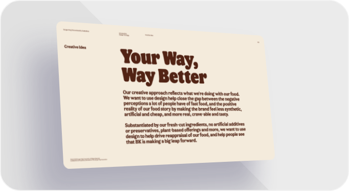 Burger King® Brand Identity Guidelines Introduction Creative Idea 013 Design Strategy Creative Idea Your Way, Way Better Our creative approach reflects what we're doing with our food. We want to use design help close the gap between the negative perceptions a lot of people have of fast food, and the positive reality of our food story by making the brand feel less synthetic, artificial and cheap, and more real, crave-able and tasty. Substantiated by our fresh-cut ingredients, no artificial additives or preservatives, plant-based offerings and more, we want to use design to help drive reappraisal of our food, and help people see that BK is making a big leap forward. TM & © 2020 Burger King Corporation. All Rights Reserved. Confidential and Proprietary Information of The Burger King Corporation