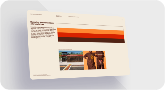 Burger King® Brand Identity Guidelines Visual Identity Masterbrand Color Alternate Stripes 107 Illustration: Stripes Illustration: Masterbrand Color Alternate Stripes In certain instances where simplicity is required, such as uniforms and directional stripes, we utilize our alternate stripes. The alternate stripes reduce the number of colors to four of our masterbrand colors in the following order: Mayo Egg White, Flaming Orange, Fiery Red, and BBQ Brown. Masterbrand Color Alternate Stripes Examples TM & © 2020 Burger King Corporation. All Rights Reserved. Confidential and Proprietary Information of The Burger King Corporation