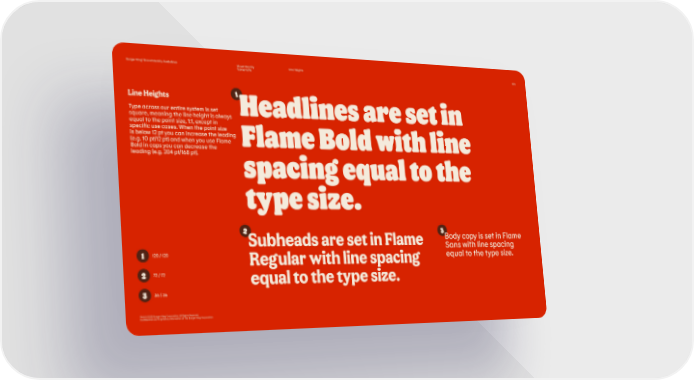 Burger King® Brand Identity Guidelines Visual Identity Line Heights 072 Typography Line Heights 1 Type across our entire system is set Headlines are set in square, meaning the line height is always equal to the point size, 1:1, except in specific use cases. When the point size is below 12 pt you can increase the leading (e.g. 10 pt/12 pt) and when you use Flame Flame Bold with line Bold in caps you can decrease the leading (e.g. 204 pt/168 pt). spacing equal to the type size. 2 3 Subheads are set in Flame Body copy is set in Flame Sans with line spacing 1 120 / 120 Regular with line spacing equal to the type size. 2 72 / 72 equal to the type size. 3 36 / 36 TM & © 2020 Burger King Corporation. All Rights Reserved. Confidential and Proprietary Information of The Burger King Corporation