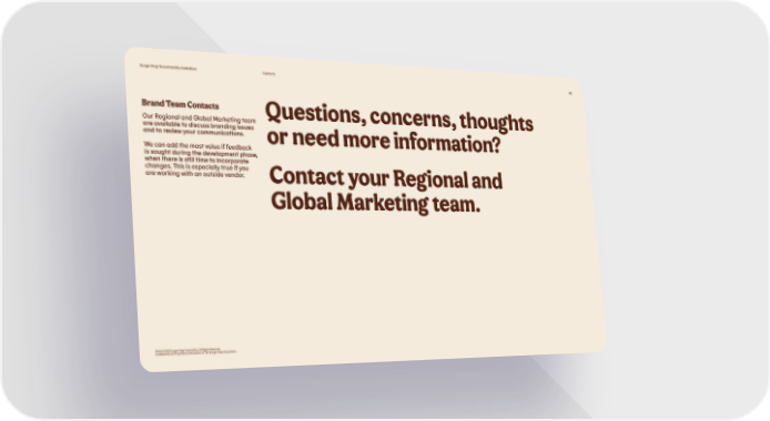 Burger King® Brand Identity Guidelines Contacts 128 Brand Team Contacts Questions, concerns, thoughts Our Regional and Global Marketing team are available to discuss branding issues and to review your communications. or need more information? We can add the most value if feedback is sought during the development phase, when there is still time to incorporate changes. This is especially true if you are working with an outside vendor. Contact your Regional and Global Marketing team. TM & © 2020 Burger King Corporation. All Rights Reserved. Confidential and Proprietary Information of The Burger King Corporation