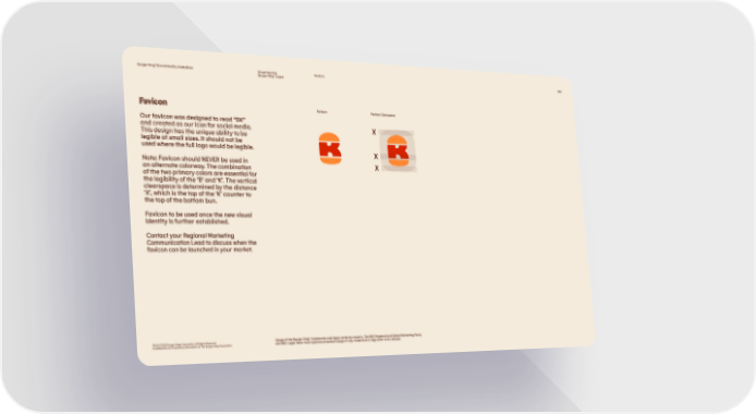 Burger King® Brand Identity Guidelines Visual Identity Favicon 043 Burger King® Logos Favicon Favicon Favicon Clearspace Our favicon was designed to read “BK” and created as our icon for social media. This design has the unique ability to be legible at small sizes. It should not be used where the full logo would be legible. Note: Favicon should NEVER be used in an alternate colorway. The combination of the two primary colors are essential for the legibility of the ‘B’ and ‘K’. The vertical clearspace is determined by the distance ‘X’, which is the top of the ‘K’ counter to the top of the bottom bun. Favicon to be used once the new visual identity is further established. Contact your Regional Marketing Communication Lead to discuss when the favicon can be launched in your market. TM & © 2020 Burger King Corporation. All Rights Reserved. Usage of the Burger King® trademarks and logos varies by country. The BKC Regional and Global Marketing Team, Confidential and Proprietary Information of The Burger King Corporation and BKC Legal Team must approve proposed usage of any trademark or logo prior to its release.