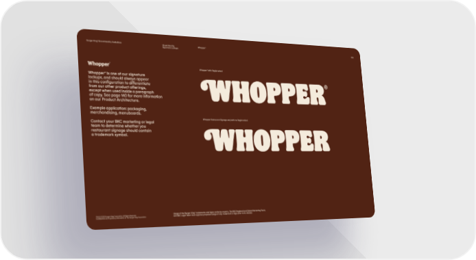 Burger King® Brand Identity Guidelines Visual Identity Whopper® 053 Signature Lockups ® Whopper Whopper® (with Registration) Whopper® is one of our signature lockups, and should always appear in this configuration to differentiate from our other product offerings, except when used inside a paragraph of copy. See page 140 for more information on our Product Architecture. Example application: packaging, merchandising, menuboards. Whopper Restaurant Signage only (with no Registration) Contact your BKC marketing or legal team to determine whether you restaurant signage should contain a trademark symbol. TM & © 2020 Burger King Corporation. All Rights Reserved. Usage of the Burger King® trademarks and logos varies by country. The BKC Regional and Global Marketing Team, Confidential and Proprietary Information of The Burger King Corporation and BKC Legal Team must approve proposed usage of any trademark or logo prior to its release.