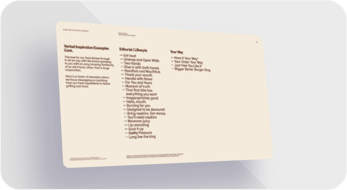 Burger King® Brand Identity Guidelines Verbal Identity 029 Verbal Inspiration Examples Verbal Inspiration Examples Editorial / Lifestyle Your Way Cont. — Eat loud — Have It Your Way® The love for our food shines through — Unwrap and Open Wide — Your Order Your Way in all we say, with the brand speaking — Two Hands — Just How You Like It to you with an easy, knowing familiarity — Dive in with both hands — Bigger Better Burger King of an old friend, rather than a large — Handfuls and Mouthfuls corporation. — Thank your mouth Here is a taster of examples where — Handle with flavor we focus messaging on anything — For You and Yours from our fresh ingredients to flame- — Moment of truth grilling and more. — That first bite has everything you want — Inappropriately good — Hello, mouth. — Burning for you — Designed to be devoured — Bring napkins. Get messy. — You’ll need napkins — Mmmmm juicy — Lip-smacking — Suck it up — Guilty Pleasure — Long live the king TM & © 2020 Burger King Corporation. All Rights Reserved. Taglines and examples included on this slide must be reviewed by BK® legal team for trademark Confidential and Proprietary Information of The Burger King Corporation clearance, and local legal counsel for compliance with applicable laws and regulations.