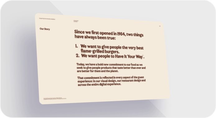 Burger King® Brand Identity Guidelines Introduction 007 Our Story Our Story Since we first opened in 1954, two things have always been true: 1. We want to give people the very best flame-grilled burgers. ® 2. We want people to Have It Your Way. Today, we have a bold new commitment to our food as we seek to give people products that taste better than ever and are better for them and the planet. That commitment is reflected in every aspect of the guest experience: in our visual design, our restaurant design and across the entire digital experience. TM & © 2020 Burger King Corporation. All Rights Reserved. Confidential and Proprietary Information of The Burger King Corporation