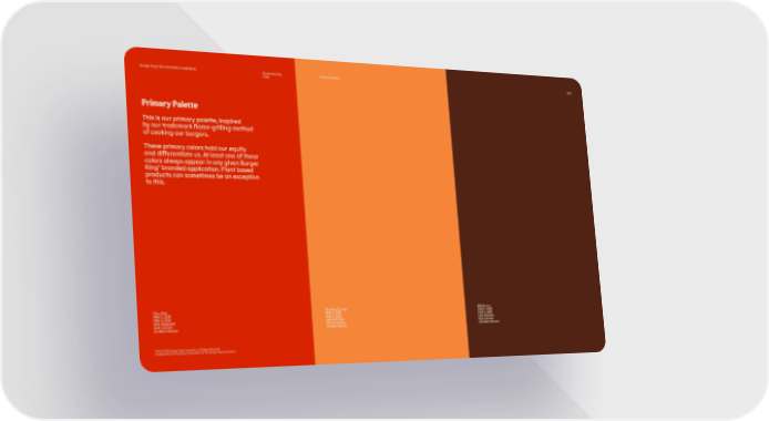 Burger King® Brand Identity Guidelines Visual Identity Primary Palette 063 Color Primary Palette This is our primary palette, inspired by our trademark flame-grilling method of cooking our burgers. These primary colors hold our equity and differentiate us. At least one of these colors always appear in any given Burger King® branded application. Plant based products can sometimes be an exception to this. Fiery Red Flaming Orange BBQ Brown PMS C: 2347 PMS C: 2018 PMS C: 4695 PMS U: 2347 PMS U: 2018 PMS U: 4695 HEX: #D62300 HEX: #FF8732 HEX: #502314 R215 G35 B0 R255 G135 B50 R80 G35 B20 C0 M95 Y100 K0 C0 M60 Y90 K0 C20 M80 Y80 K70 TM & © 2020 Burger King Corporation. All Rights Reserved. Confidential and Proprietary Information of The Burger King Corporation