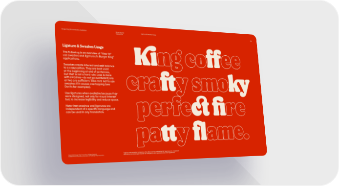Burger King® Brand Identity Guidelines Visual Identity Ligature & Swashes Usage 076 Typography Ligature & Swashes Usage The following is an overview of “How-To” use swashes and ligatures in Burger King® applications. King coffee Swashes create interest and add balance to a composition. They are best used at the beginning at end of sentences, but that is not a hard rule. Less is more with swashes—do not go overboard; one or two are sufficient. Take care not to use swashes if it causes overlapping (see Don’ts for examples). crafty smoky Use ligatures when available because they were designed, not only for visual interest but, to increase legibility and reduce space. Note that swashes and ligatures are independent of a specific language and can be used in any translation. perfect fire patty flame. TM & © 2020 Burger King Corporation. All Rights Reserved. Taglines and examples included on this slide must be reviewed by BK® legal team for trademark Confidential and Proprietary Information of The Burger King Corporation clearance, and local legal counsel for compliance with applicable laws and regulations.