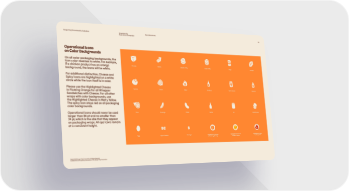 Burger King® Brand Identity Guidelines Visual Identity Operational Icons 115 Illustration: Iconography Operational Icons on Color Backgrounds On all color packaging backgrounds, the icon color reverses to white. For example, if a chicken product has an orange Cheese Bacon Double Patty Triple Patty Mayo Lettuce background, the icons will be white. For additional distinction, Cheese and Spicy icons are highlighted on a white circle while the icon itself is in color. Please use the Highlighted Cheese Tomato Onion Spicy Ketchup Tartar Sauce Mustard in Flaming Orange for all Whopper Sandwiches with Cheese. For all other wraps with color backgrounds, use the Highlighted Cheese in Melty Yellow. The spicy icon stays red on all packaging color backgrounds. Operational icons should never be used Ham Sausage Pickle Bottle Jar Hash Browns larger than 84 pt and no smaller than 24 pt, which is the size that they appear on packaging wraps. All ops icons remain at a consistent height. EC S Egg Egg & Cheese Sausage Highlighted Cheese Highlighted Cheese Highlighted Spicy in Flaming Orange in Melty Yellow in Fiery Red TM & © 2020 Burger King Corporation. All Rights Reserved. Confidential and Proprietary Information of The Burger King Corporation