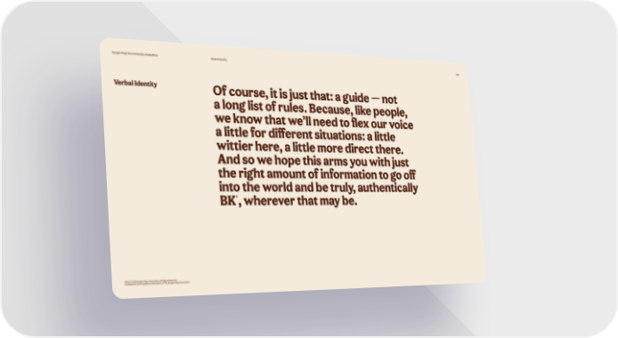 Burger King® Brand Identity Guidelines Verbal Identity 021 Verbal Identity Of course, it is just that: a guide — not a long list of rules. Because, like people, we know that we’ll need to flex our voice a little for different situations: a little wittier here, a little more direct there. And so we hope this arms you with just the right amount of information to go off into the world and be truly, authentically ® BK, wherever that may be. TM & © 2020 Burger King Corporation. All Rights Reserved. Confidential and Proprietary Information of The Burger King Corporation