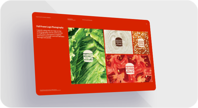 Burger King® Brand Identity Guidelines Visual Identity Full-Frame Logo Photography 091 Grid System & Layouts Full-Frame Logo Photography Layouts using only our logo on top of photography can be used as long as sufficient clearspace is applied and there is enough contrast between the logo and photo. TM & © 2020 Burger King Corporation. All Rights Reserved. Confidential and Proprietary Information of The Burger King Corporation
