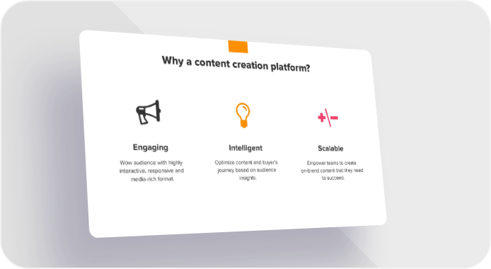 Why a content creation platform? Engaging Intelligent Scalable Wow audience with highly Optimize content and buyer’s Empower teams to create interactive, responsive and journey based on audience on-brand content that they need media-rich format. insights. to succeed.