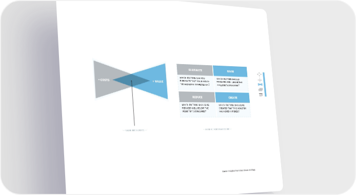 227 which factors should be raised well above the industry's standard? which factors should be created that the industry has never offered? which factors should be reduced well below the industry's standard? which factors can you eliminate that your indus- try has long competed on? — four actions framework — — value innovation — + value – costs eliminate raise reduce create Source: Adapted from Blue Ocean Strategy. bmgen_final.indd 227 6/15/10 5:44 PM