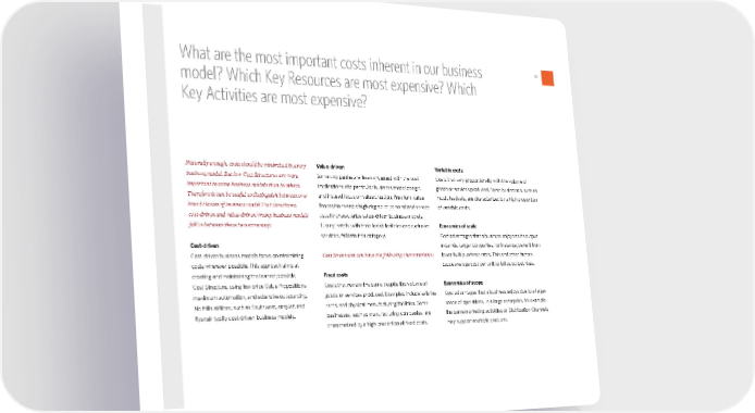 41 Naturally enough, costs should be minimized in every business model. But low Cost Structures are more important to some business models than to others. Therefore it can be useful to distinguish between two broad classes of business model Cost Structures: cost-driven and value-driven (many business models fall in between these two extremes): Cost-driven Cost-driven business models focus on minimizing costs wherever possible. This approach aims at creating and maintaining the leanest possible Cost Structure, using low price Value Propositions, maximum automation, and extensive outsourcing. No frills airlines, such as Southwest, easyJet, and Ryanair typify cost-driven business models. Value-driven Some companies are less concerned with the cost implications of a particular business model design, and instead focus on value creation. Premium Value Propositions and a high degree of personalized service usually characterize value-driven business models. Luxury hotels, with their lavish facilities and exclusive services, fall into this category. Cost Structures can have the following characteristics: Fixed costs Costs that remain the same despite the volume of goods or services produced. Examples include salaries, rents, and physical manufacturing facilities. Some businesses, such as manufacturing companies, are characterized by a high proportion of fixed costs. Variable costs Costs that vary proportionally with the volume of goods or services produced. Some businesses, such as music festivals, are characterized by a high proportion of variable costs. Economies of scale Cost advantages that a business enjoys as its output expands. Larger companies, for instance, benefit from lower bulk purchase rates. This and other factors cause average cost per unit to fall as output rises. Economies of scope Cost advantages that a business enjoys due to a larger scope of operations. In a large enterprise, for example, the same marketing activities or Distribution Channels may support multiple products. What are the most important costs inherent in our business model? Which Key Resources are most expensive? Which Key Activities are most expensive? bmgen_final.indd 41 6/15/10 5:32 PM
