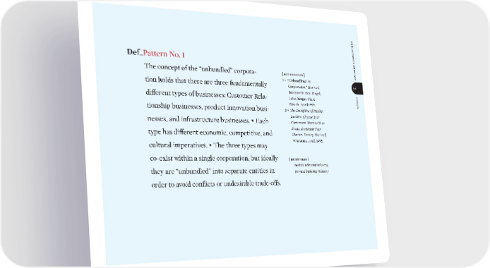 patterns 57 unbundling b usi ness p att erns The concept of the “unbundled” corpora- tion holds that there are three fundamentally diΩerent types of businesses: Customer Rela- tionship businesses, product innovation busi- nesses, and infrastructure businesses. • Each type has diΩerent economic, competitive, and cultural imperatives. • The three types may co-exist within a single corporation, but ideally they are “unbundled” into separate entities in order to avoid conflicts or undesirable trade-oΩs. Def_ Pattern No. 1 [ ref·er·ences ] 1 • “Unbundling the Corporation. ” Harvard Business Review. Hagel, John, Singer, Marc. March–April 1999. 2 • The Discipline of M arket Leaders: Choose Your Customers, Narrow Your Focus, Dominate Your Market. Treacy, Michael, Wiersema, Fred. 1995. [ ex·am·ples ] mobile telecom industry, private banking industry bmgen_final.indd 57 6/15/10 5:33 PM