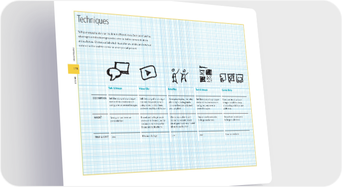 178 storyteLLIng desIgn 178 Talk & Image Video Clip Role Play Text & Image Comic Strip description Tell the story of a protago- nist and his environment using one or several images Tell the story of a protago- nist and his environment using video to blur lines between reality and fi ction Have people play the roles of a story’s protagonists to make the scenario real and tangible Tell the story of a protago- nist and his environment using text and one or several images Use a series of cartoon images to tell the story of a protagonist in a tan- gible way when? Group or conference presentation Broadcast to large audi- ences or in-house use for decisions with important fi nancial implications Workshops where par- ticipants present newly developed business model ideas to each other Reports or broadcasts to large audiences Reports or broadcasts to large audiences time & cost Low Medium to high Low Low Low to medium Techniques Telling an engaging story can be done in different ways. Each technique has advantages and disadvantages and is better suited for certain situations and audiences. Choose a suitable technique after you understand who your audience will be and the context in which you will present. bmgen_final.indd 178 6/15/10 5:43 PM