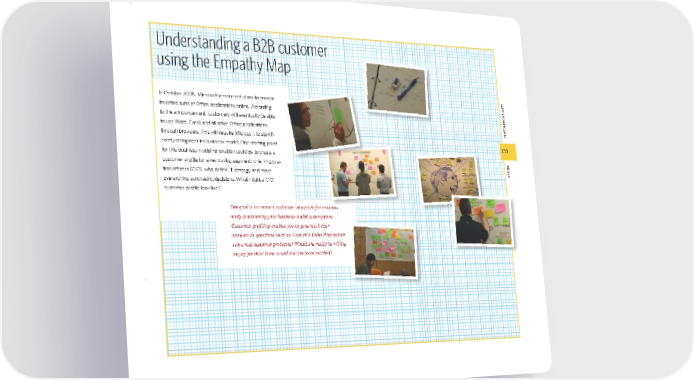 133 Customer InsIghts desIgn 133 In October 2008, Microsoft announced plans to provide its entire suite of OΩice applications online. According to the announcement, customers will eventually be able to use Word, Excel, and all other OΩice applications through browsers. This will require Microsoft to signifi - cantly reengineer its business model. One starting point for this business model renovation could be to create a customer profi le for a key buying segment: chief informa- tion oΩicers (CIO), who defi ne IT strategy and make overarching purchasing decisions. What might a CIO customer profi le look like? The goal is to create a customer viewpoint for continu- ously questioning your business model assumptions. Customer profi ling enables you to generate better answers to questions such as: Does this Value Proposition solve real customer problems? Would she really be willing to pay for this? How would she like to be reached? Understanding a B2B customer using the Empathy Map bmgen_final.indd 133 6/15/10 5:39 PM