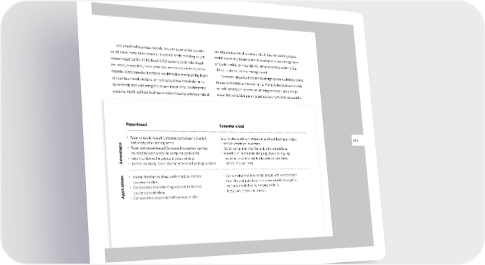 267 In the realm of business models, too, computer-aided systems could make many tasks easier and quicker, while revealing as-yet unseen opportunity. At the least, CAD systems could help visual- ize, store, manipulate, track, annotate, and communicate business models. More complex functions would involve manipulating layers or business model versions, or moving business model elements dynamically and evaluating the impact in real-time. Sophisticated systems might facilitate business model critiquing, provide a reposi- Paper-based • Paper or poster-based Canvases can be easily created and used just about anywhere • Paper and poster-based Canvases impose few barriers: no need to learn a specific computer application • Very intuitive and engaging in group settings • Fosters creativity, spurs ideation when used on large surfaces • Napkin sketches to draw, understand, or explain business models • Collaborative brainstorming sessions to develop business model ideas • Collaborative assessment of business models Computer-aided Easy to create, store, manipulate, and track business models • Enable remote collaboration • Quick, comprehensive financial, other simulations • Provide business model design guidance (critiquing systems, business model database, pattern ideas, control mechanisms) • Collaborative business model design with remote teams • Complex manipulations of business models (navigation, business model layers, merging models) • Deep, comprehensive analysis Advantages Applications tory of business model patterns and off-the-shelf building blocks, enable distributed business model development and management, simulate models, or integrate with other enterprise systems (e.g. ERP or business process management). Computer-aided business model design systems will likely evolve in step with interface improvements. Manipulating business models on wall-sized touch screens would bring computer-aided design closer to the intuitive paper-based approach and improve usability. bmgen_final.indd 267 6/15/10 6:01 PM