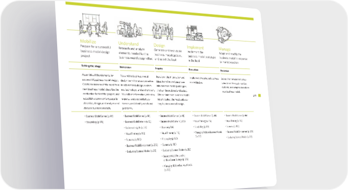 249 Mobilize Understand Design Implement Manage objective Prepare for a successful business model design project Research and analyze elements needed for the business model design eΩort Generate and test viable business model options, and select the best Implement the business model prototype in the fi eld Adapt and modify the business model in response to market reaction focus Setting the stage Immersion Inquiry Execution Evolution description Assemble all the elements for successful business model design. Create awareness of the need for a new business model, describe the motivation behind the project, and establish a common language to describe, design, and analyze and discuss business models. You and the business model design team immerse yourselves in relevant knowledge: custom- ers, technology, and environment. You collect information, interview experts, study potential cus- tomers, and identify needs and problems. Transform the information and ideas from the previous phase into business model prototypes that can be explored and tested. After an intensive business model inquiry, select the most satisfac- tory business model design. Implement the selected business model design. Set up the management struc- tures to continuously monitor, evaluate, and adapt or transform your business model. book sections • Business Model Canvas (p. 44) • Storytelling (p. 170) • Business Model Canvas (p. 44) • Business Model Patterns (p. 52) • Customer Insights (p. 126) • Visual Thinking (p. 146) • Scenarios (p. 180) • Business Model Environment (p. 200) • Evaluating Business Models (p. 212) • Business Model Canvas (p. 44) • Business Model Patterns (p. 52) • Ideation (p. 134) • Visual Thinking (p. 146) • Prototyping (p. 160) • Scenarios (p. 180) • Evaluating Business Models (p. 212) • Business Model Perspective on Blue Ocean Strategy (p. 226) • Managing Multiple Business Models (p. 232) • Business Model Canvas (p. 44) • Visual Thinking (p. 146) • Storytelling (p. 170) • Managing Multiple Business Models (p. 232) • Business Model Canvas (p. 44) • Visual Thinking (p. 146) • Scenarios (p. 180) • Business Model Environment (p. 200) • Evaluating Business Models (p. 212) bmgen_final.indd 249 6/15/10 5:45 PM