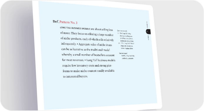 patterns 67 the long tail long tail business models are about selling less of more: They focus on oΩering a large number of niche products, each of which sells relatively infrequently. • Aggregate sales of niche items can be as lucrative as the traditional model whereby a small number of bestsellers account for most revenues. • Long Tail business models require low inventory costs and strong plat- forms to make niche content readily available to interested buyers. [ ref·er·ences ] 1 • The Long Tail: Why the F uture of Business Is Selling Less of More. Anderson, Chris. 2006. 2 • “The Long Tail.” W ired Magazine. Anderson, Chris. October 2004. [ ex·am·ples ] Netflix, eBay, YouTube, Facebook, Lulu.com Def_ Pattern No. 2 bmgen_final.indd 67 6/15/10 5:35 PM