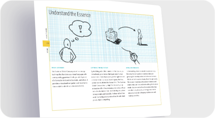 152 VIsuaL thInKIng desIgn 152 visual grammar The Business Model Canvas poster is a concep- tual map that functions as a visual language with corresponding grammar. It tells you which pieces of information to insert in the model, and where. It provides a visual and text guide to all the informa- tion needed to sketch out a business model. capturing the big picture By sketching out all the elements of the Canvas you immediately give viewers the big picture of a busi- ness model. A sketch provides just the right amount of information to allow a viewer to grasp the idea, yet not too much detail to distract him. The Business Model Canvas visually simplifi es the reality of an enterprise with all its processes, structures, and sys- tems. In a business model like Rolls-Royce’s, where jet engine units are leased by the hour rather than sold, it is the big picture, rather than the individual pieces, that is compelling. seeing relationships Understanding a business model requires not only knowing the compositional elements, but also grasping the interdependencies between elements. This is easier to express visually than through words. This is even more true when several elements and relationships are involved. In describing the business model of a low-cost airline, for example, drawings can effectively show why a homogenous fl eet of airplanes is crucial to keeping maintenance and training costs low. Understand the Essence bmgen_final.indd 152 6/15/10 5:41 PM