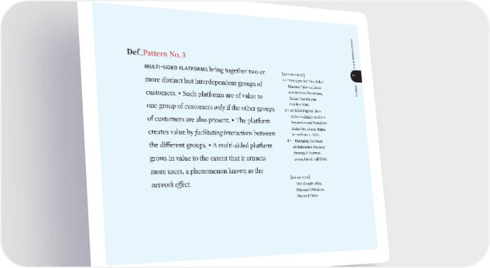 patterns 77 Multi- s ided p lat for M s multi-sided platforms bring together two or more distinct but interdependent groups of customers. • Such platforms are of value to one group of customers only if the other groups of customers are also present. • The platform creates value by facilitating interactions between the diΩerent groups. • A multi-sided platform grows in value to the extent that it attracts more users, a phenomenon known as the network eΩect. [ ref·er·ences ] 1 • “Str ategies for Two-Sided Markets.” Harvard Busi- ness Review . Eisenmann, Parker, Van Alstyne. October 2006. 2 • Invisible E ngines: How Software Platforms Drive Innovation and Transform Industries. Evans, Hagiu, Schmalensee. 2006. 3 • “Managing the M aze of Multisided Markets.” Strategy & Business. Evans, David. Fall 2003. [ ex·am·ples ] Visa, Google, eBay, Microsoft Windows, Financial Times Def_ Pattern No. 3 bmgen_final.indd 77 6/15/10 5:35 PM