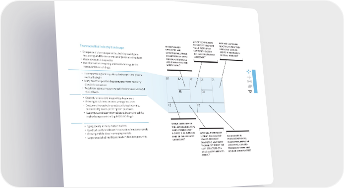 207 Main Qs Pharmaceutical Industry Landscape technology trends Identifi es technology trends that could threaten your business model—or enable it to evolve or improve What are the major technology trends both inside and outside your market? Which technologies represent important opportunities or disruptive threats? Which emerging technologies are peripheral customers adopting? • Emergence of pharmacogenomics, declining cost of gene sequencing, and the immenent rise of personalized medicine • Major advances in diagnostics • Use of pervasive computing and nanotechnology for the injection/delivery of drugs regulatory trends Describes regulations and regulatory trends that infl uence your business model Which regulatory trends infl uence your market? What rules may affect your business model? Which regulations and taxes affect customer demand? • Heterogeneous global regulatory landscape in the pharma- ceutical industry • Many countries prohibit drug companies from marketing directly to consumers • Regulatory agency pressure to publish data on unsuccessful clinical trials societal and cultural trends Identifi es major societal trends that may infl uence your business model Describe key societal trends. Which shifts in cultural or societal values affect your business model? Which trends might infl uence buyer behavior? • Generally unfavorable image of big drug makers • Growing social consciousness among consumers • Customers increasingly conscious of global warming, sustainability issues, prefer “green” purchases • Customers are better informed about drug maker activity in developing countries (e.g. HIV/AIDS drugs) socioeconomic trends Outlines major socioeconomic trends relevant to your business model What are the key demographic trends? How would you characterize income and wealth distribution in your market? How high are disposable incomes? Describe spending patterns in your market (e.g. housing, health- care, entertainment, etc.). What portion of the popula- tion lives in urban areas as opposed to rural settings? • Aging society in many mature markets • Good but costly healthcare infrastructure in mature markets • Growing middle class in emerging markets • Large, unsatisfi ed healthcare needs in developing countries which new key resources and activities will prove advantageous when personalized drugs and diagnostics are widely used? which technologies are likely to improve value proposition competitiveness in the evolving pharma landscape? how are customers reacting to new tech- nological develop- ments in the pharma- ceutical industry? do advances in pharmacogenomics, diagnostics, pervasive computing, or nano- technology offer new revenue opportunities? how will technology such as pharmacoge- nomics, pervasive computing, and nano- technology affect the cost structure of a drug maker’s business model? which partnerships will become essential when pharmacoge- nomics is an integral part of the industry landscape? VP CR CH CS KP KA KR R$ C$ • Heterogeneous global regulatory landscape in the pharma- ceutical industry • Many countries prohibit drug companies from marketing directly to consumers • Regulatory agency pressure to publish data on unsuccessful clinical trials bmgen_final.indd 207 6/15/10 5:44 PM