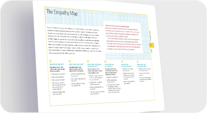 131 Customer InsIghts desIgn 131 1 what does she see? describe what the customer sees in her environment • What does it look like? • Who surrounds her? • Who are her friends? • What types of oΩers is she exposed to daily (as opposed to all market oΩers)? • What problems does she encounter? 2 what does she hear? describe how the environment infl u- ences the customer • What do her friends say? Her spouse? • Who really infl uences her, and how? • Which media Channels are infl uential? 3 what does she really think and feel? try to sketch out what goes on in your customer’s mind • What is really important to her (which she might not say publicly)? • Imagine her emotions. What moves her? • What might keep her up at night? • Try describing her dreams and aspirations. 4 what does she say and do? imagine what the customer might say, or how she might behave in public • What is her attitude? • What could she be telling others? • Pay particular attention to potential confl icts between what a customer might say and what she may truly think or feel. 5 what is the customer’s pain? • What are her biggest frustrations? • What obstacles stand between her and what she wants or needs to achieve? • Which risks might she fear taking? 6 what does the customer gain? • What does she truly want or need to achieve? • How does she measure success? • Think of some strategies she might use to achieve her goals. The Empathy Map Few of us enjoy the services of a full team of social scientists, but anybody examining a business model can sketch profi les of the Customer Segments addressed therein. A good way to start is by using the Empathy Map, a tool developed by visual thinking company XPLANE. This tool, which we also like to call the “really simple customer profi ler,” helps you go beyond a customer’s demographic characteristics and develop a better understanding of environment, behavior, concerns, and aspirations. Doing so allows you to devise a stronger business model, because a customer profi le guides the design of better Value Propositions, more convenient ways to reach customers, and more appropriate Customer Relationships. Ultimately it allows you to better understand what a customer is truly willing to pay for. How to Use the (Customer) Empathy Map Here’s how it works. First, brainstorm to come up with all the possible Customer Segments that you might want to serve using your business model. Choose three promising candidates, and select one for your fi rst profi ling exercise. Start by giving this customer a name and some demographic characteristics, such as income, marital status, and so forth. Then, referring to the diagram on the opposite page, use a fl ipchart or whiteboard to build a profi le for your newly-named customer by asking and answering the following six questions: bmgen_final.indd 131 6/15/10 5:39 PM