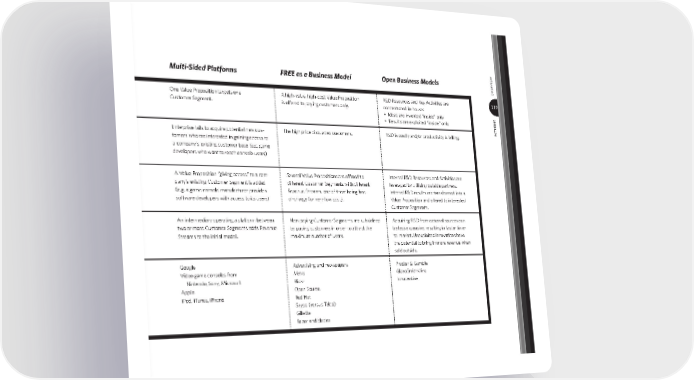 oVerVieW patterns 119 Unbundling Business Models The Long Tail Multi-Sided Platforms FREE as a Business Model Open Business Models context (before) An integrated model combines infrastructure management, product innovation, and Customer Relationships under one roof. The Value Proposition targets only the most profi table clients. One Value Proposition targets one Customer Segment. A high-value, high-cost Value Proposition is offered to paying customers only. R&D Resources and Key Activities are concentrated in-house: • Ideas are invented “inside” only • Results are exploited “inside” only challenge Costs are too high. Several confl icting organizational cultures are combined in a single entity, resulting in undesirable trade-offs. Targeting less profi table segments with specifi c Value Propositions is too costly. Enterprise fails to acquire potential new cus- tomers who are interested in gaining access to a company’s existing customer base (e.g. game developers who want to reach console users) The high price dissuades customers. R&D is costly and/or productivity is falling. solution (after) The business is unbundled into three separate but complementary models dealing with • Infrastructure management • Product innovation • Customer relationships The new or additional Value Proposition targets a large number of historically less profi table, niche Customer Segments—which in aggregate are profi table. A Value Proposition “giving access” to a com- pany’s existing Customer Segment is added (e.g. a game console manufacturer provides software developers with access to its users) Several Value Propositions are offered to different Customer Segments with different Revenue Streams, one of them being free- of-charge (or very low cost). Internal R&D Resources and Activities are leveraged by utilizing outside partners. Internal R&D results are transformed into a Value Proposition and offered to interested Customer Segments. rationale IT and management tool improvements allow separating and coordinating different business models at lower cost, thus eliminating undesir- able trade-offs. IT and operations management improvements allow delivering tailored Value Propositions to a very large number of new customers at low cost. An intermediary operating a platform between two or more Customer Segments adds Revenue Streams to the initial model. Non-paying Customer Segments are subsidized by paying customers in order to attract the maximum number of users. Acquiring R&D from external sources can be less expensive, resulting in faster time- to-market. Unexploited innovations have the potential to bring in more revenue when sold outside. examples Private Banking Mobile Telco Publishing Industry (Lulu.com) LEGO Google Video game consoles from Nintendo, Sony, Microsoft Apple iPod, iTunes, iPhone Advertising and newspapers Metro Flickr Open Source Red Hat Skype (versus Telco) Gillette Razor and blades Procter & Gamble GlaxoSmithKline Innocentive bmgen_final.indd 119 6/15/10 5:39 PM