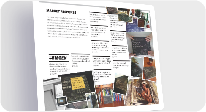 277 #bmgen @business_design Three steps to effective use of "Business Model Generation": 1) Buy book 2) Test live 3) Be amazed ;-) http://bit.ly/OzZh0 @Acluytens Excitement! Business Model Genera- tion book arrived! It's going to be an “I'm reading weekend," sorry darling! :-) #bmgen @tkeppins Still quiet in the house this sunday morning. Enjoying a cappuccino and reading Business Model Generation. @hvandenbergh I have a dilemma now: to catch up on class reading or have fun with Business Model Generation by @business_design... @vshamanov Just got my copy of Business Model Generation by @business_design designed by @thinksmith Even more beautiful than I imagined #bmgen @remarkk heading over to #ftjco to visit @ryan- taylor and borrow his copy of #bmgen tonight. Exciting evening all-around! @bgilham I'm SO tempted to write all over my copy of #bmgen, but it's too beautiful to destroy. Think I need 2 copies. #bmgento @skanwar Just got my copy of Business Model Generation - looks to be as beautifully made as it is useful. Congrats! @francoisnel @business_design I am BLOWN AWAY by the stuff I've learned from #bmgen!! I can't thank you guys enough for writing it! @will_lam Is reading Business Model Genera- tion... This is perhaps the neatest and most innovative book I have ever read! @jhemlig I am so in love with my copy! Thanks @business_design #bmgen @evelynso market response The market response to Business Model Generation has been extremely gratifying. The first print run of 5,000 books sold out in two months, with no marketing budget and without the support of a traditional publisher. News about the book spread exclusively by word-of-mouth, blogs, Web sites, e-mail, and Twitter. Most gratifying of all, local meetups, where readers and Hub followers got together to discuss Business Model Genera- tion's content, formed spontaneously worldwide. 277 @skanwar beautiful ation": 1) Buy book 2) Test live 3) ;-) http://bit.ly/OzZh0 @Acluytens I'm SO c opy of t o destroy. #bmg @skanwar @skanwar bmgen_final.indd 277 6/15/10 6:02 PM