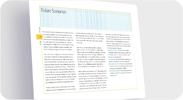 186 sCenarIos desIgn tion is driven in part by pharmacogenomics, in part by advances in diagnostics, and in part by renewed cost- consciousness amid growing awareness that prevention is less expensive than hospitalization and treatment. These two drivers suggest trends that may or may not materialize and thus provide four scenarios illustrated in the fi gure opposite. These are: • business as usual: Personal medicine fails to materialize despite its technological feasibility (e.g. for privacy reasons, etc.) and treatment remains the core revenue generator. • my.medicine: Personal medicine materializes, but treatment remains the core revenue generator. • the healthy patient: The shift toward preventive medicine continues, but personal medicine remains a fad despite technological feasibility. • reinventing pharma: Personal and preventive medicine comprise the new growth areas of the drug industry. Future Scenarios The scenario is another thinking tool that helps us refl ect on business models of the future. Scenarios kick-start our creativity by providing concrete future contexts for which we can invent appropriate business models. This is usually easier and more productive than free brain- storming about possible future business models. It does require, however, developing several scenarios, which can be costly depending on their depth and realism. One sector under strong pressure to devise innovative new business models is the pharmaceutical industry. There are a number of reasons for this. Major player research productivity has declined in recent years, and these companies face enormous challenges discovering and marketing new blockbuster drugs—traditionally the core of their businesses. At the same time, patents on many of their cash cow drugs are expiring. This means revenues from those drugs are likely to be lost to generic drug manufacturers. This combination of empty product pipelines and evaporating revenue are just two head- aches plaguing incumbent pharmaceutical makers. In this turbulent context, combining business model brainstorming with the development of a set of future scenarios can be a powerful exercise. The scenarios help trigger out-of-the-box thinking, which is not always easy when trying to develop innovative business models. Here’s an overview of how such an exercise might be conducted. First, we must devise a set of scenarios that paint pictures of the future of the pharmaceutical industry. This is best left to scenario planning specialists equipped with the right tools and methodology. To illustrate, we developed four bare bones scenarios based on two crite- ria that may shape the evolution of the pharma industry over the next decade. There are, of course, several other drivers and many different scenarios that could be crafted based on deeper research into the industry. The two drivers we’ve selected are (1) the emergence of personalized medicine and (2) the shift from treatment toward prevention. The former is based on advances in pharmacogenomics, the science of identifying underlying causes of diseases based on a person’s DNA structure. Someday, this may result in completely personalized treatment, using customized drugs based on a person’s genetic structure. The shift from treatment to preven- 186 bmgen_final.indd 186 6/15/10 5:44 PM