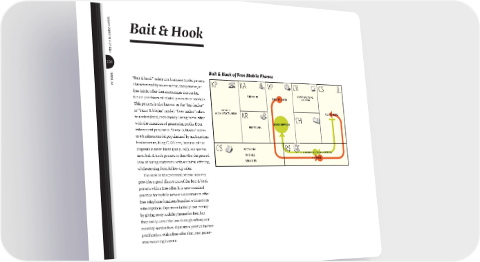 104 patterns free as a business Model “Bait & hook” refers to a business model pattern characterized by an attractive, inexpensive, or free initial offer that encourages continuing future purchases of related products or services. This pattern is also known as the “loss leader” or “razor & blades” model. “Loss leader” refers to a subsidized, even money-losing initial offer with the intention of generating profi ts from subsequent purchases. “Razor & blades” refers to a business model popularized by an American businessman, King C. Gillette, inventor of the disposable razor blade (see p. 105). We use the term bait & hook pattern to describe the general idea of luring customers with an initial offering, while earning from follow-up sales. The mobile telecommunications industry provides a good illustration of the bait & hook pattern with a free offer. It is now standard practice for mobile network operators to offer free telephone handsets bundled with service subscriptions. Operators initially lose money by giving away mobile phones for free, but they easily cover the loss through subsequent monthly service fees. Operators provide instant gratifi cation with a free offer that later gener- ates recurring income. Bait & Hook device manufacturers services free phones subscription contractual lock-in customers network network phones services n x monthly subscription 1 x free Bait & Hook of Free Mobile Phones n x monthly subscription n x monthly subscription VP CR CH CS KP KA KR R$ C$ n x monthly subscription n x monthly subscription n x monthly subscription n x monthly subscription R$ n x monthly subscription n x monthly subscription customers customers 1 x free free phones subscription 1 x free 1 x free 1 x free free phones subscription bmgen_final.indd 104 6/15/10 5:38 PM