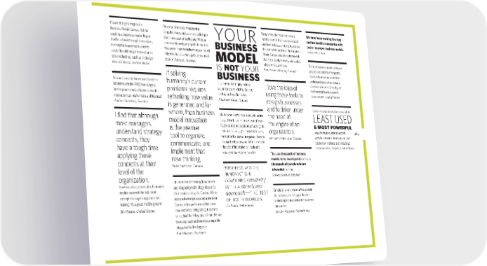 It’s one thing to map out a Bus iness Mod el Can vas. But for cre ating a bus iness mod el tha t in its elf is a bre akthrough inn ovation, it is hel pful to use too ls use d to cre ate bre akthrough inn ovation in othe r ind ustries, suc h as in des ign. Ellen Di Resta, United States Aravind uses the Fre emium Bus iness Mod el to ena ble FRE E eye sur gery for the poor in India. Business model innovation can re ally make a differ ence! Anders Sundelin, Sweden I find that although most managers understand str ategy concep ts, they have a tough time applying these conc epts at their level of the organization. h ow ever, discussions about business models connec t the high-lev el conc epts to day- to-day decision- making. It' s a gre at middle ground. Bill Welter, United States Personas, Scenarios, Vis ualization, Emp athy map s, and so on are tec hniques tha t I hav e use d sin ce the lat e 199 0s in use r exp erience typ e pro jects. In the las t few yea rs I hav e see n tha t the y are inc red- ibly eff ective at a str ategy/business lev el. Eirik V Johnsen, Norway If solving humanity’s current problems requir es rethinking how value is gener ated and for whom, then business model innovation is the premier tool to organize, communic ate, and implement that new thinking. Nabil Harfoush, Canada I'm interested in hearing how people are integr ating technology ideas into their models using the Canvas. We 've explored adding it as a separat e layer (above or below financial) but have now settled on integr ating it as not es on each of the 9 ke y are as. Fr om this we then st ep back and dev elop a separat e integrat ed technology plan. Rob Manson, Australia Yo U r business model I s not Y o U r business It’s a method of inquiry to help you understand what to do next. Tes ting and iter ation is ke y. Matthew Milan, Canada Multi-sided platforms are actually rather easy at the business model lev el; the dif- ficult y comes in execution: attracting the "subsidized side," pricing on both sides, vertical or horizontal integr ation, how to change the business model in st ep with the size of the marke t on each side. Hampus Jakobsson, Sweden business model innovation combines creativity with a structured approach —the best of both worlds. Ziv Baida, Netherlands Many of my clients do not have a holistic view of their business model and tend to focus on trying to address the immediate problem. The Business Model Canvas pro vides a framew ork that helps clarify the why, who, what, when, where, and how . Patrick van Abbema, Canada I lov e the idea of using these tools to design businesses and to tinker under the hoo d of the engine of an organization. Michael Anton Dila, Canada There are thousands of business models to be inves tigated and many tho usands of people who are interested in the m. Steven Devijver, Belgium Simplicity is very important to explain the patterns and to trigger the non- pro fessional's involv ement in business inn ovation. Gertjan Verstoep, Netherlands We have been working too long and too hard for companies with bad or improper business models. Lytton He, China The term business model is thrown around a lot and more frequently than not to mean an incomple te understanding of what makes a business a business (mostly just the financial/ revenue aspect). Livia Labate, United States Business model innovation is one of the LEAST u SE D & most powerful ways to cre ate sustainable pro fit grow th, economic dev elopment and creat e new ‘marke ts’ and ‘industries’. Deborah Mills-Scofield, United States 261 bmgen_final.indd 261 6/15/10 6:01 PM