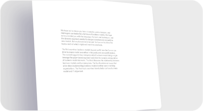 We hope we’ve shown you how visionaries, game changers, and challengers can tackle the vital issue of business models. We hope we’ve provided you with the language, the tools and techniques, and the dynamic approach needed to design innovative and competitive new models. But much remains to be said. So here we touch on five topics, each of which might well merit its own book. The first examines business models beyond profit: how the Canvas can drive business model innovation in the public and non-profit sectors. The second suggests how computer-aided business model design might leverage the paper-based approach and allow for complex manipulation of business model elements. The third discusses the relationship between business models and business plans. The fourth addresses issues that arise when implementing business models in either new or existing organizations. The final topic examines how to better achieve business model and IT alignment. bmgen_final.indd 263 6/15/10 6:01 PM