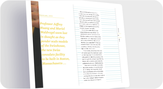 sCenarIos desIgn 181 181 F e b r u a r y, 2 0 0 0 Professor JeΩrey Huang and Muriel Waldvogel seem lost in thought as they ponder scale models of the Swisshouse, the new Swiss consulate facility to be built in Boston, Massachusetts . . . . . . Huang and Waldvogel were brought in to conceive the architectural design of the building, which, rather than issuing visas, will serve as a networking and knowledge exchange hub. The two are studying several scenarios of how people will use the Swisshouse, and have constructed both physical models and screenplay-like texts designed to make tangible the purpose of this unprecedented government facility. One scenario describes Nicolas, a brain surgeon who has just moved to Boston from Switzerland. He visits the Swisshouse to meet likeminded scientists and other members of the Swiss-American community. A second scenario tells the story of a Professor Smith, who uses the Swisshouse to present his MIT Media Lab research to Boston’s Swiss community and to academics at two Swiss universities, using a high-speed Internet connection. These scenarios, while simple, are the result of intensive research into roles the new type of consulate might play. The stories illustrate the Swiss government’s intentions and serve as think- ing tools to guide the building’s design. Ultimately, the new facility effectively accommodated the applications imagined and fulfi lled its objectives. Today, almost a decade after its conception, the Swisshouse enjoys an outstanding reputa- tion for helping build stronger international ties in greater Boston’s science and technology communities. Under the banner of the Swiss Knowledge Network, or swissnex, the Swisshouse has inspired “colleague” facilities in Bangalore, San Francisco, Shanghai, and Singapore. F e b r u a r y, 2 0 0 0 Professor JeΩrey Huang and Muriel Waldvogel seem lost in thought as they ponder scale models of the Swisshouse, the new Swiss consulate facility to be built in Boston, Massachusetts . . . bmgen_final.indd 181 6/15/10 5:44 PM