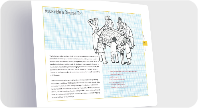 143 desIgn 143 IdeatIon The task of generating new ideas should not be left exclusively to those typically con- sidered to be “creative types.” Ideation is a team exercise. In fact, by its very nature business model innovation requires the participation of people from across the entire organization. Business model innovation is about seeking to create value by exploring new business model building blocks and forging innovative links between blocks. This can involve all nine blocks of the canvas, whether Distribution Channels, Revenue Streams, or Key Resources. Thus it requires input and ideas from people representing multiple areas. That’s why assembling the right task force is a critical prerequisite for generating new business model ideas. Thinking about business model innovation should not be confi ned to the R&D unit or the strategic planning offi ce. Business model innova- tion teams should have a diverse membership. The diversity will help you generate, discuss, and select new ideas. Consider adding outsiders, or even children. Diversity works. But make sure to teach people how to listen actively, and consider engaging a neutral facilitator for key meetings. The task of generating new ideas should not be left exclusively to those typically con- sidered to be “creative types.” Ideation is a team exercise. In fact, by its very nature business model innovation requires the participation of people from across the entire organization. Business model innovation is about seeking to create value by exploring Assemble a Diverse Team A diverse business model innovation team has members . . . • from various business units • of different ages • with different areas of expertise • of differing levels of seniority • with a mixture of experiences • from different cultural backgrounds bmgen_final.indd 143 6/15/10 5:40 PM