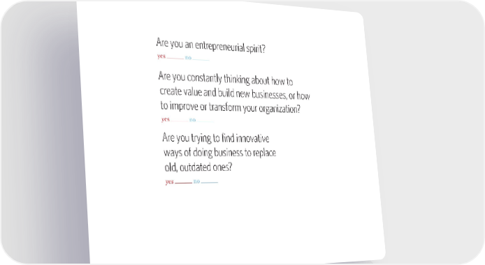 Are you an entrepreneurial spirit? yes _______ no _______ Are you constantly thinking about how to create value and build new businesses, or how to improve or transform your organization? yes _______ no _______ Are you trying to find innovative ways of doing business to replace old, outdated ones? yes _______ no _______ bmgen_final.indd 2 6/15/10 5:31 PM