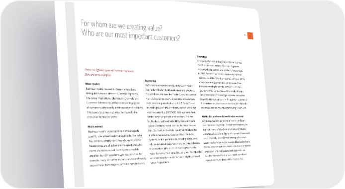 21 There are diΩerent types of Customer Segments. Here are some examples: Mass market Business models focused on mass markets don’t distinguish between diΩerent Customer Segments. The Value Propositions, Distribution Channels, and Customer Relationships all focus on one large group of customers with broadly similar needs and problems. This type of business model is often found in the consumer electronics sector. Niche market Business models targeting niche markets cater to specific, specialized Customer Segments. The Value Propositions, Distribution Channels, and Customer Relationships are all tailored to the specific require- ments of a niche market. Such business models are often found in supplier-buyer relationships. For example, many car part manufacturers depend heavily on purchases from major automobile manufacturers. Segmented Some business models distinguish between market segments with slightly diΩerent needs and problems. The retail arm of a bank like Credit Suisse, for example, may distinguish between a large group of customers, each possessing assets of up to U.S. $100,000, and a smaller group of aΩluent clients, each of whose net worth exceeds U.S. $500,000. Both segments have similar but varying needs and problems. This has implications for the other building blocks of Credit Suisse’s business model, such as the Value Proposi- tion, Distribution Channels, Customer Relationships, and Revenue streams. Consider Micro Precision Systems, which specializes in providing outsourced micromechanical design and manufacturing solutions. It serves three diΩerent Customer Segments—the watch industry, the medical industry, and the industrial automation sector—and oΩers each slightly diΩerent Value Propositions. Diversified An organization with a diversified customer business model serves two unrelated Customer Segments with very diΩerent needs and problems. For example, in 2006 Amazon.com decided to diversify its retail business by selling “cloud computing” services: online storage space and on-demand server usage. Thus it started catering to a totally diΩerent Customer Segment—Web companies—with a totally diΩerent Value Proposition. The strategic rationale behind this diversification can be found in Amazon.com’s powerful IT infrastructure, which can be shared by its retail sales operations and the new cloud computing service unit. Multi-sided platforms (or multi-sided markets) Some organizations serve two or more interdepen- dent Customer Segments. A credit card company, for example, needs a large base of credit card holders and a large base of merchants who accept those credit cards. Similarly, an enterprise oΩering a free news- paper needs a large reader base to attract advertisers. On the other hand, it also needs advertisers to finance production and distribution. Both segments are required to make the business model work (read more about multi-sided platforms on p. 76). For whom are we creating value? Who are our most important customers? bmgen_final.indd 21 6/15/10 5:32 PM