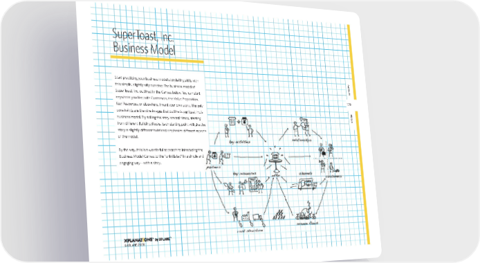 179 aCtIVIty desIgn 179 Talk & Image Video Clip Role Play Text & Image Comic Strip description Tell the story of a protago- nist and his environment using one or several images Tell the story of a protago- nist and his environment using video to blur lines between reality and fi ction Have people play the roles of a story’s protagonists to make the scenario real and tangible Tell the story of a protago- nist and his environment using text and one or several images Use a series of cartoon images to tell the story of a protagonist in a tan- gible way when? Group or conference presentation Broadcast to large audi- ences or in-house use for decisions with important fi nancial implications Workshops where par- ticipants present newly developed business model ideas to each other Reports or broadcasts to large audiences Reports or broadcasts to large audiences time & cost Low Medium to high Low Low Low to medium SuperToast, Inc. Business Model Start practicing your business model storytelling skills with this simple, slightly silly exercise: The business model of SuperToast, Inc. outlined in the Canvas below. You can start anywhere you like: with Customers, the Value Proposition, Key Resources, or elsewhere. Invent your own story. The only constraints are the nine images that outline SuperToast Inc.’s business model. Try telling the story several times, starting from different Building Blocks. Each starting point will give the story a slightly different twist and emphasize different aspects of the model. By the way, this is a wonderful approach to introducing the Business Model Canvas to the “uninitiated” in a simple and engaging way—with a story. ©XPLANE 2008 constraints are the nine images that outline SuperToast Inc.’s business model. Try telling the story several times, starting from different Building Blocks. Each starting point will give the story a slightly different twist and emphasize different aspects By the way, this is a wonderful approach to introducing the Business Model Canvas to the “uninitiated” in a simple and constraints are the nine images that outline SuperToast Inc.’s business model. Try telling the story several times, starting from different Building Blocks. Each starting point will give the story a slightly different twist and emphasize different aspects By the way, this is a wonderful approach to introducing the Business Model Canvas to the “uninitiated” in a simple and bmgen_final.indd 179 6/15/10 5:43 PM
