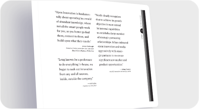 open business Models patterns 115 “Open Innovation is fundamen- tally about operating in a world of abundant knowledge, where not all the smart people work for you, so you better go find them, connect to them, and build upon what they can do.” —— Henry Chesbrough Executive Director, Center for Open Innovation Haas School of Business, UC Berkeley “Long known for a preference to do everything in-house, we began to seek out innovation from any and all sources, inside, outside the company.” —— A.G. Lafl ey Chairman & CEO, P&G “Nestlé clearly recognizes that to achieve its growth objective it must extend its internal capabilities to establish a large number of strategic partnering relationships. It has embraced open innovation and works aggressively with strate- gic partners to co-create significant new market and product opportunities.” —— Helmut Traitler Head of Innovation Partnerships, Nestlé bmgen_final.indd 115 6/15/10 5:38 PM