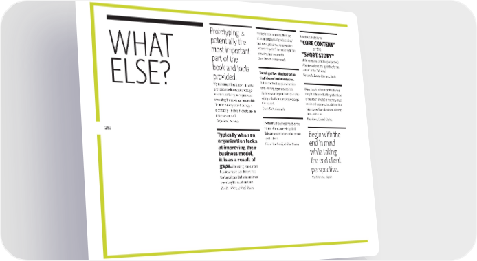 Prototyping is pote ntially the mos t imp ortant par t of the boo k and too ls prov ided. My reasoning is based upon the stress and resis tance that established orga- nizations are facing in the proc ess of innovating their own business models. The refore a ver y pot ent str ategy is prot otyping—in order to cre ate buy-in pro cesses nee ded. Terje Sand, Norway Typically when an organization looks at improving their business model, it is as a result of gaps. Visualizing your cur rent bus iness mod el can dem onstrate the logical gaps that exist and make th em tan gible as act ion ite ms. Ravila White, United States In established companies, there are often ample physic al "produc t ideas" that nev er ge t serious consider ation because they don't immediately fit the prevailing business model. Gert Steens, Netherlands Do not get too attached to the first idea or implementation. Build in feedback loops and monitor early warning signals to explicitly challenge your original conc ept and be willing and able to comple tely change it if requir ed. Erwin Fielt, Australia The freemium business model as the rev erse of insuranc e—insightful! Makes me want to turn other models upside down! Victor Lombardi, United States A business model is the "core content" or the "SH ort S tor Y" of the company (actual or prospec tive). A business plan is the “guideline for the action” or the “full st ory.” Fernando Saenz-Marrero, Spain When I work with non-profits the first thing I tell them is that they in fact have a "business" (model) in that they must creat e and cap ture value, whether that value comes from donations, subscrip- tions, and so on. Kim Korn, United States Begin with the end in mind while taking the end client perspective. Karl Burrow, Japan WhA T ELSE? 260 bmgen_final.indd 260 6/15/10 6:01 PM
