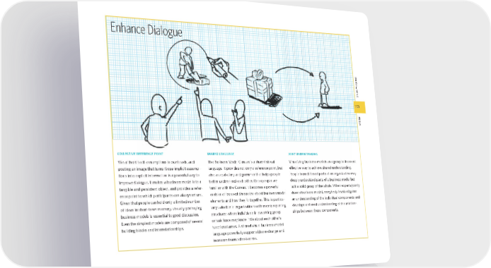 153 VIsuaL thInKIng desIgn 153 joint understanding Visualizing business models as a group is the most effective way to achieve shared understanding. People from different parts of an organization may deeply understand parts of a business model but lack a solid grasp of the whole. When experts jointly draw a business model, everybody involved gains an understanding of the individual components and develops a shared understanding of the relation- ships between these components. collective reference point We all hold tacit assumptions in our heads, and posting an image that turns those implicit assump- tions into explicit information is a powerful way to improve dialogue. It makes a business model into a tangible and persistent object, and provides a refer- ence point to which participants can always return. Given that people can hold only a limited number of ideas in short-term memory, visually portraying business models is essential to good discussion. Even the simplest models are composed of several building blocks and interrelationships. shared language The Business Model Canvas is a shared visual language. It provides not only a reference point, but also a vocabulary and grammar that helps people better understand each other. Once people are familiar with the Canvas, it becomes a powerful enabler of focused discussion about business model elements and how they fi t together. This is particu- larly valuable in organizations with matrix reporting structures where individuals in a working group or task force may know little about each other’s functional areas. A shared visual business model language powerfully supports idea exchange and increases team cohesiveness. Enhance Dialogue bmgen_final.indd 153 6/15/10 5:41 PM