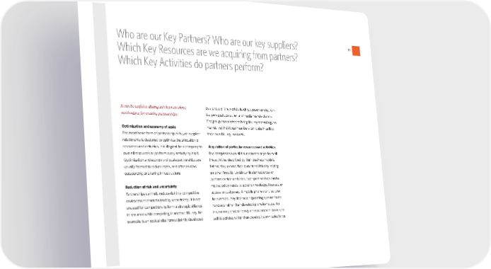 39 It can be useful to distinguish between three motivations for creating partnerships: Optimization and economy of scale The most basic form of partnership or buyer-supplier relationship is designed to optimize the allocation of resources and activities. It is illogical for a company to own all resources or perform every activity by itself. Optimization and economy of scale partnerships are usually formed to reduce costs, and often involve outsourcing or sharing infrastructure. Reduction of risk and uncertainty Partnerships can help reduce risk in a competitive environment characterized by uncertainty. It is not unusual for competitors to form a strategic alliance in one area while competing in another. Blu-ray, for example, is an optical disc format jointly developed by a group of the world’s leading consumer electron- ics, personal computer, and media manufacturers. The group cooperated to bring Blu-ray technology to market, yet individual members compete in selling their own Blu-ray products. Acquisition of particular resources and activities Few companies own all the resources or perform all the activities described by their business models. Rather, they extend their own capabilities by relying on other firms to furnish particular resources or perform certain activities. Such partnerships can be motivated by needs to acquire knowledge, licenses, or access to customers. A mobile phone manufacturer, for example, may license an operating system for its handsets rather than developing one in-house. An insurer may choose to rely on independent brokers to sell its policies rather than develop its own sales force. Who are our Key Partners? Who are our key suppliers? Which Key Resources are we acquiring from partners? Which Key Activities do partners perform? bmgen_final.indd 39 6/15/10 5:32 PM
