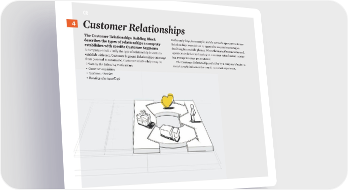 The Customer Relationships Building Block describes the types of relationships a company establishes with specifi c Customer Segments A company should clarify the type of relationship it wants to establish with each Customer Segment. Relationships can range from personal to automated. Customer relationships may be driven by the following motivations: • Customer acquisition • Customer retention • Boosting sales (upselling) Customer Relationships In the early days, for example, mobile network operator Customer Relationships were driven by aggressive acquisition strategies involving free mobile phones. When the market became saturated, operators switched to focusing on customer retention and increas- ing average revenue per customer. The Customer Relationships called for by a company’s business model deeply infl uence the overall customer experience. Cr 4 bmgen_final.indd 28 6/15/10 5:32 PM