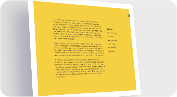 This section describes a number of techniques and tools from the world of design that can help you design better and more innovative business models. A designer’s business involves relentless inquiry into the best pos- sible way to create the new, discover the unexplored, or achieve the func- tional. A designer’s job is to extend the boundaries of thought, to generate new options, and, ultimately, to create value for users. This requires the ability to imagine “that which does not exist.” We are convinced that the tools and attitude of the design profession are prerequisites for success in the business model generation. Businesspeople unknowingly practice design every day. We design orga- nizations, strategies, business models, processes, and projects. To do this, we must take into account a complex web of factors, such as competitors, technology, the legal environment, and more. Increasingly, we must do so in unfamiliar, uncharted territory. This is precisely what design is about. What businesspeople lack are design tools that complement their business skills. The following pages explore six business model design techniques: Customer Insights, Ideation, Visual Thinking, Prototyping, Storytelling, and Scenarios. We introduce each technique with a story, then demonstrate how the technique applies to business model design. Here and there we've added exercises and suggestions for workshop activities that show you specifically how the design technique can be applied. Book references are provided at the end for those interested in exploring each technique in more depth. Design 126 Customer Insights 134 Ideation 146 Visual Thinking 160 Prototyping 170 Storytelling 180 Scenarios bmgen_final.indd 125 6/15/10 5:39 PM