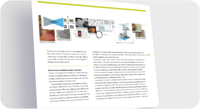 255 design decide execute inquiry provoke prototype decide decide uncertainty. If you clearly define the uncertainties involved (e.g. new pricing mechanisms, new Distribution Channels), you can prototype and test them in the market to better predict how the model will perform when launched full-scale. } Participatory design Another way to improve the likelihood of having bold ideas adopted and subsequently implemented is to be especially inclusive when assembling the design team. Co- create with people from different business units, different levels of the organizational hierarchy, and different areas of expertise. By integrating comments and concerns from across the organi- zation, your design can anticipate and possibly circumvent implementation roadblocks. } Old versus new One big design question is whether the old and new business models should be separated or integrated into one. The right design choice will greatly affect chances of suc- cess (see Managing Multiple Business Models, p. 232). } Avoid short-term focus One limitation to avoid is a short-term focus on ideas with large first- year revenue potential. Big corporations, in particular, can experience huge absolute growth. A company with annual sales of U.S. $5 billion, for example, generates $200 million in new revenues by growing at the modest rate of four percent. Few breakthrough business models can achieve such revenues during their first year (doing so would require acquiring 1.6 million new customers, each paying an annual fee of $125). Therefore, a longer-term perspective is required when exploring new business models. Otherwise, your organization is likely to miss out on many future growth opportunities. How much do you imagine Google earned in its first year? industry led to a partnership with microfinance institution Grameen Bank, which became the cornerstone of Grameenphone’s business model. Contrary to expert opinion, poor villagers were indeed willing to pay for mobile connectivity, and Grameenphone became Bangladesh’s leading telecommunications provider. Working from the Established Company Perspective } Prevent taming of bold ideas Established organizations tend to water down bold business model ideas. Your challenge is to defend their boldness —while assuring that they won’t face overwhelming obstacles if implemented. To achieve this tricky balance it can be helpful to draw a risk/reward profile of each model. The profile could include questions such as, What is the profit/loss potential? Describe potential conflicts with existing business units. How might this affect our brand? How will existing customers react? This approach can help you clarify and address the uncertainties in each model. The bolder the model, the higher the level of prototype bmgen_final.indd 255 6/15/10 6:00 PM